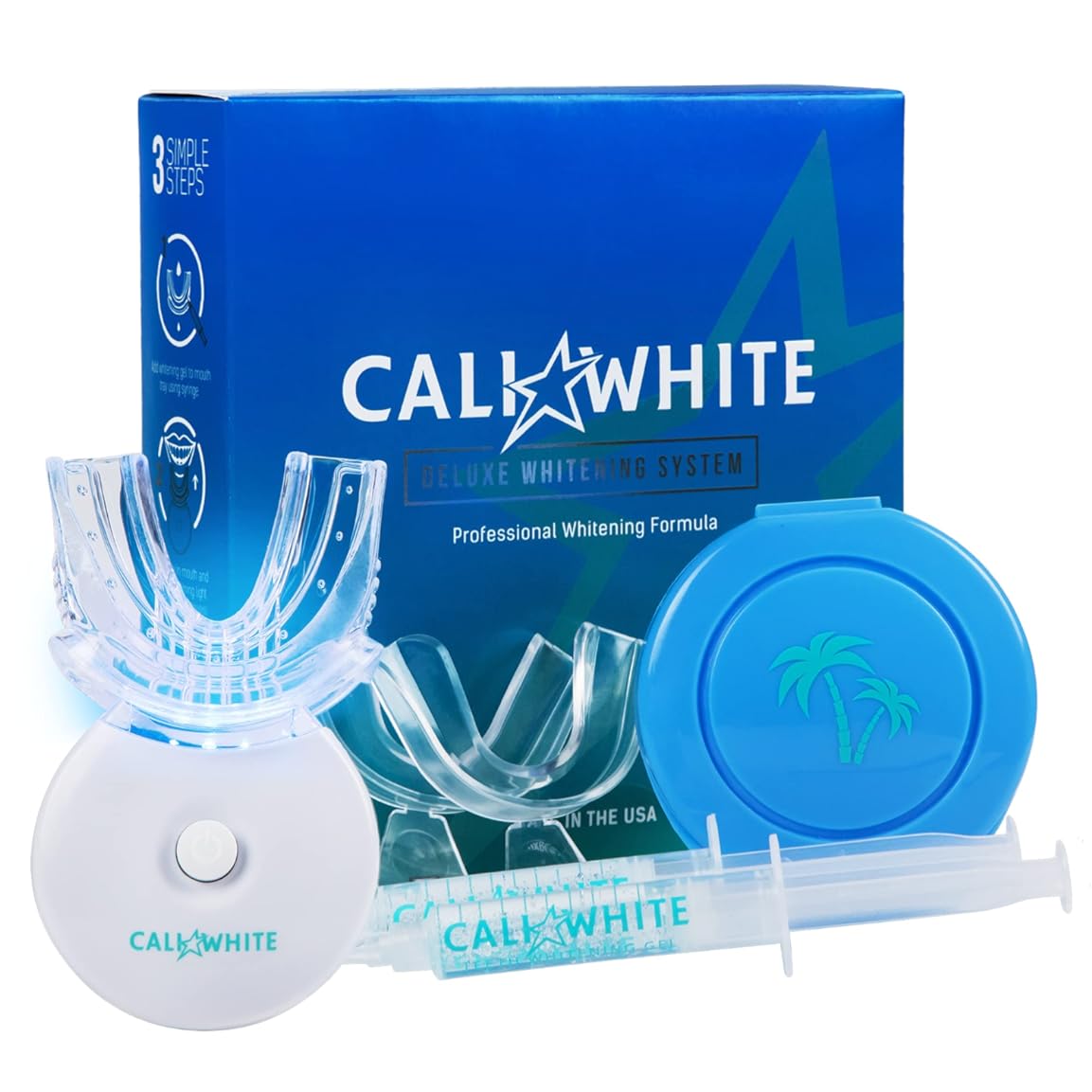 Cali White Teeth Whitening Strip Kit with LED Light + Batteries - Organic Peroxide Teeth Whitening Gel - Set of White Strips for Teeth Whitening - 2x5ml Syringes, Thermoform Whitening Kit Trays & Case