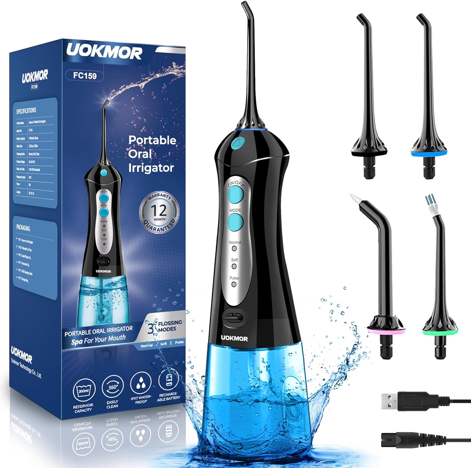 Cordless Water Flosser for Teeth Professional Water Teeth Cleaner Picks Dental Oral Irrigator with 3 Modes & 4 Jet Tips for Braces Gums, IPX7 Waterproof, 300ml Detachable Tank for Home Travel (Black)