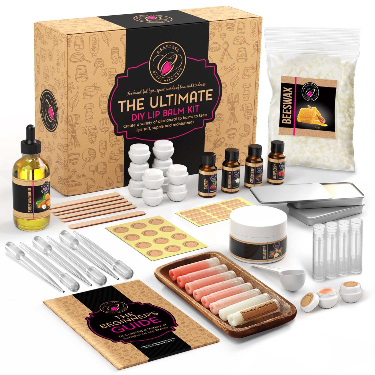 CraftZee Lip Balm Making Kit - DIY Lip Gloss Kit with Natural Beeswax, Shea Butter, Sweet Almond Oil, Essential Oils, Tubes, Jars & More Craft Kit For Adults