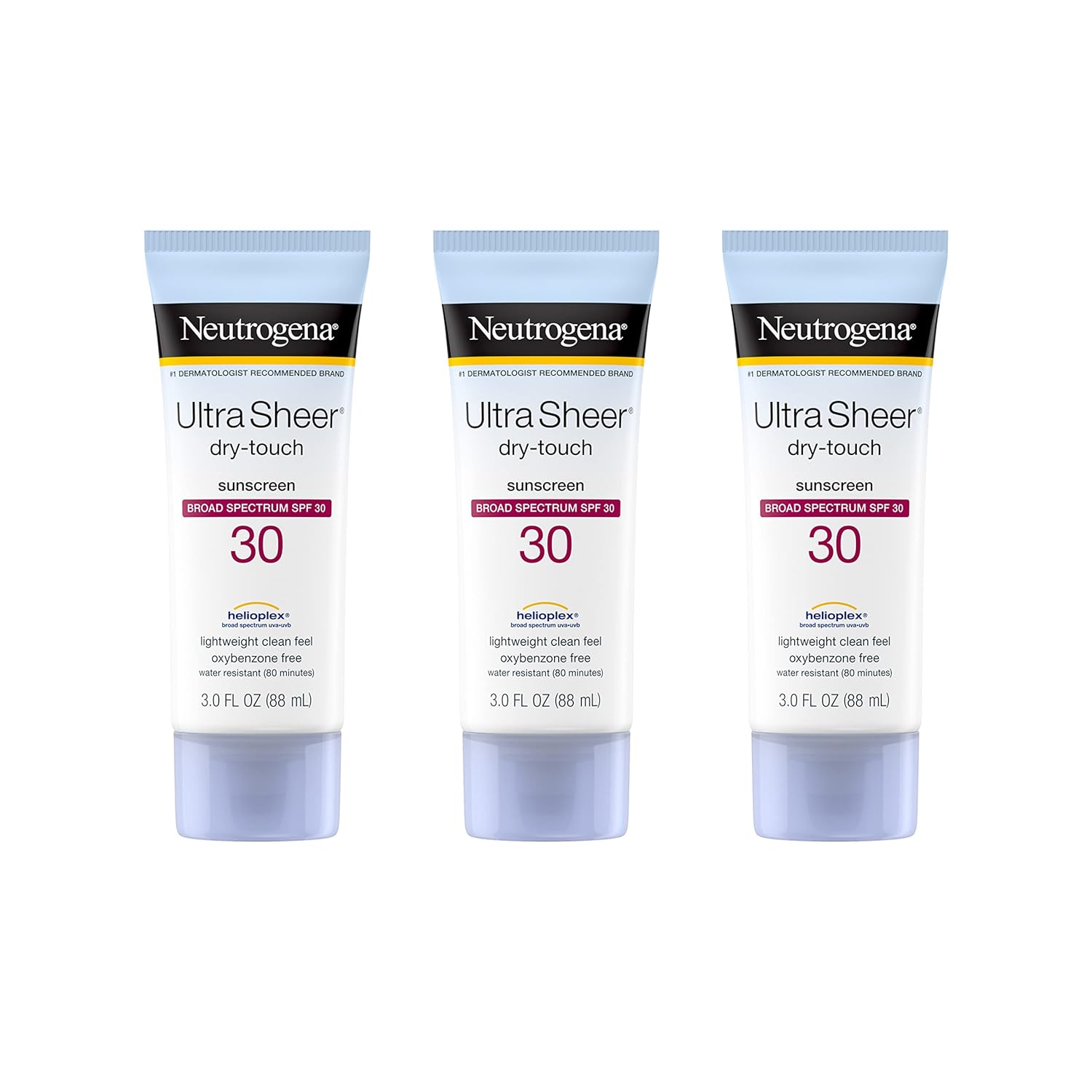 Neutrogena Ultra Sheer Dry-Touch Sunscreen Lotion, Broad Spectrum SPF 30 UVA/UVB Protection, Oxybenzone-Free, Water Resistant, Non-Comedogenic, Non-Greasy, Travel Size, 3 Fl Oz, Pack of 3