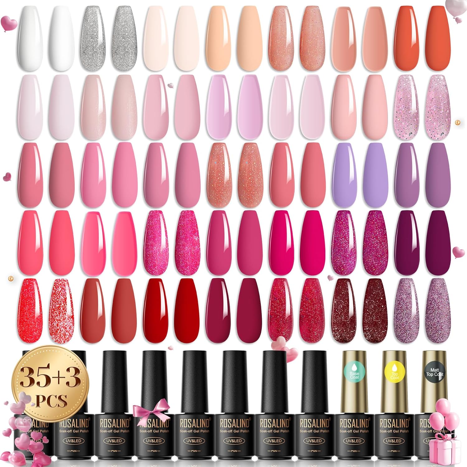ROSALIND Gel Nail Polish Set,35 Pcs Pink Red jelly White Gel Polish Valentine Alluring Sweetie Collection Starter Set Pink Colors with Glossy & Matte Top Base Coat Nail Art Gift for Manicure
