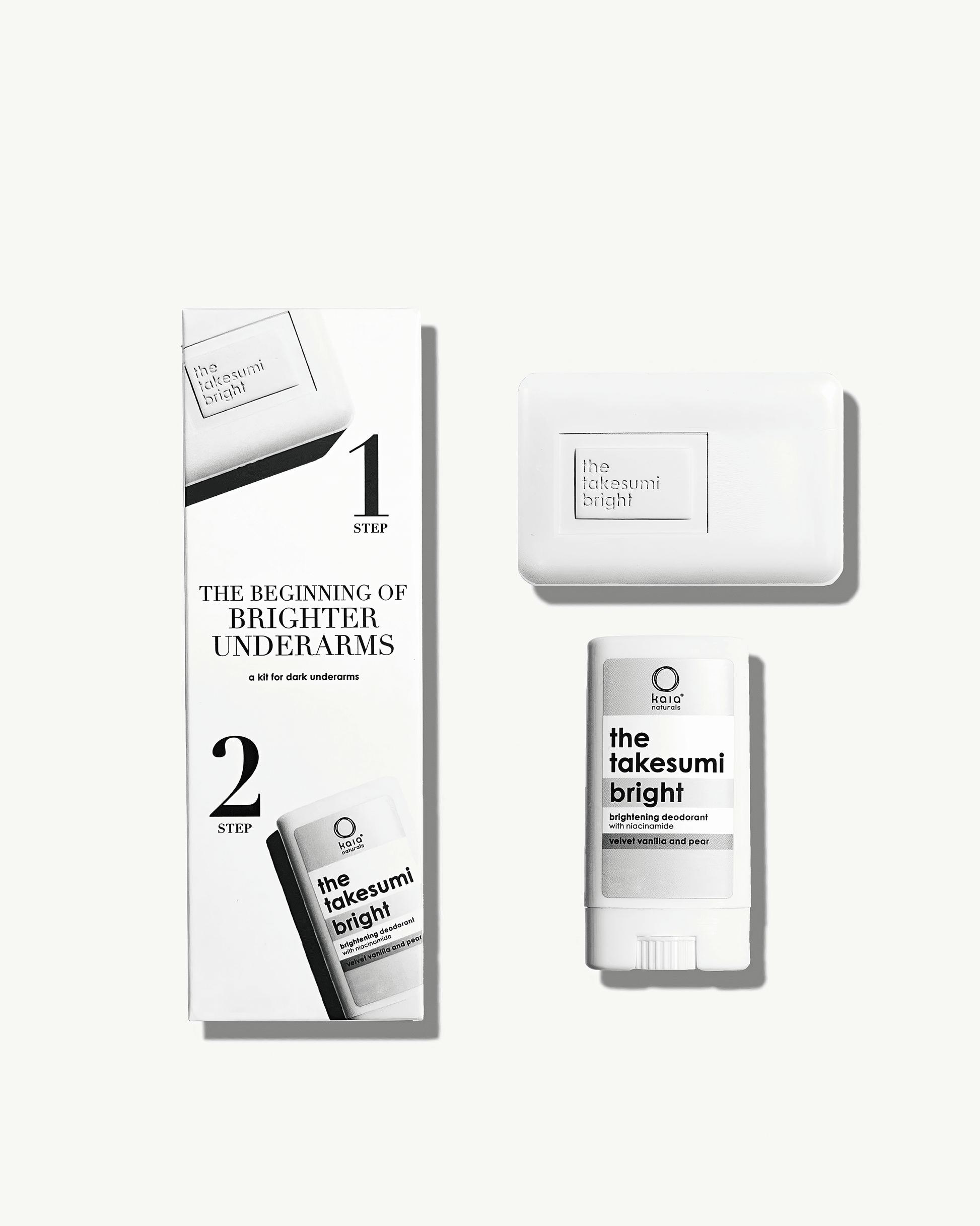 Why We Love It: Kaia Naturals The Takesumi Bright Starter Kit is a powerful underarm brightening duo. Amplify the effects of brightening ingredients with this two-step layering skincare system. Designed for speed in brightening and minimizing the appearance of dark spot pigmentation in the underarm region, due to post-inflammatory hyperpigmentation.